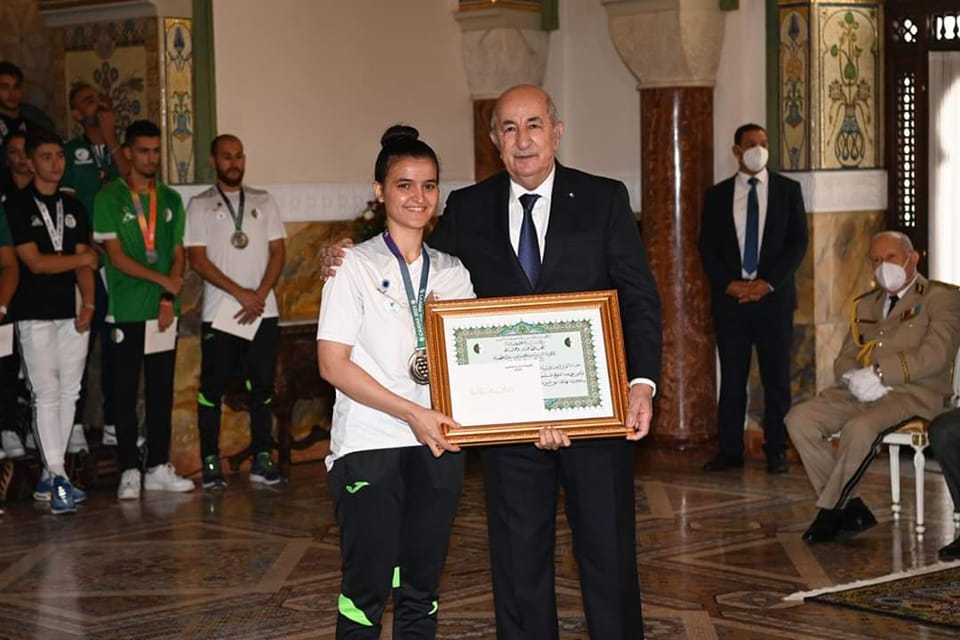 بمناسبة حفل الإستقبال والتكريم المنظم على شرف الرياضيين أبطال الجزائر، كرم السيد رئيس الجمهورية عبد المجيد تبون المصارعة بن صالح يسرى إبنة ولاية المسيلة – بلدية أولاد سيدي إبراهيم، بمناسبة فوزها بالميدالية البرونزية التي حققتها خلال مشاركتها في الألعاب الأولمبية للصم DEAFLYMPICS لرياضة الجيدو المقامة بدولة البرازيل.