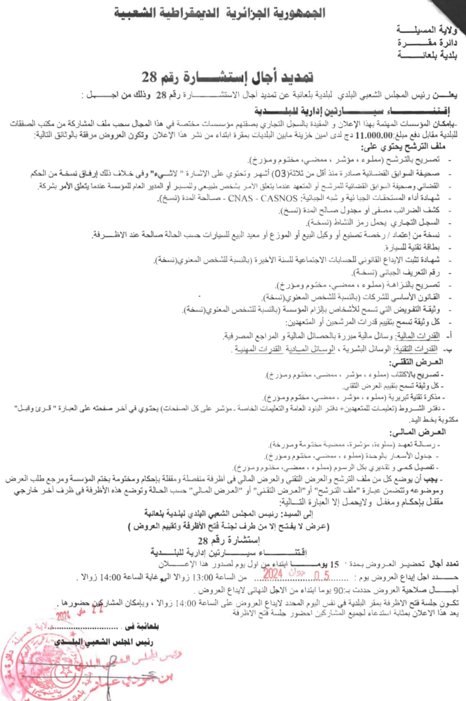 تمديد آجال الاستشارة إقتناء سيارتين إدارية للبلدية23 مايو، 20240 17 شاركها فيسبوك X مشاركة عبر البريد طباعة