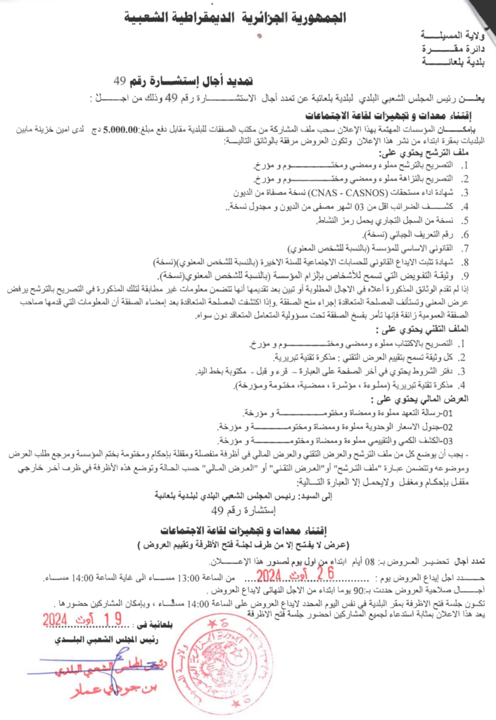 استشارة من أجل: اقتناء معدات وتجهيزات لقاعة الاجتماعات25 أغسطس، 20240 2 شاركها فيسبوك X مشاركة عبر البريد طباعة