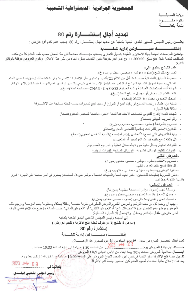 استشارة من أجل: اقتناء سيارتين ادارية لبلدية بلعايبة9 نوفمبر، 20230 12 شاركها فيسبوك X مشاركة عبر البريد طباعة