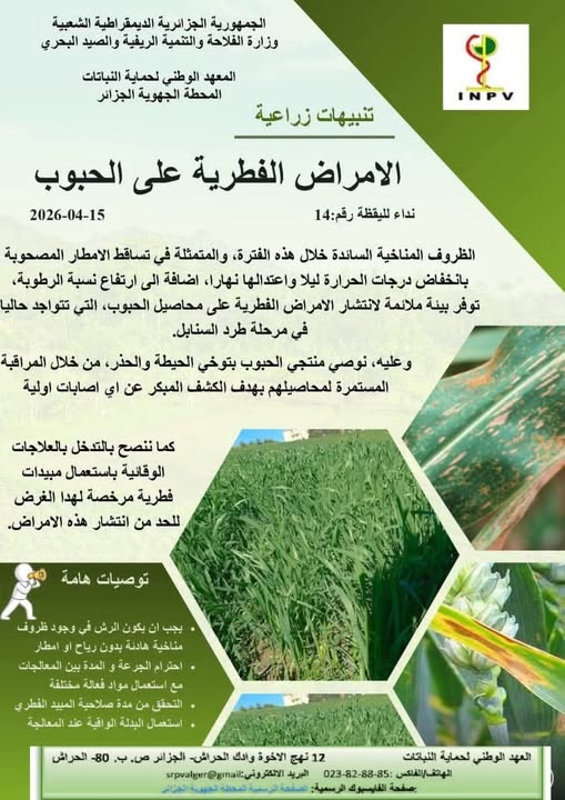 الأمراض الفطرية شعبة الحبوب: نتيجة الرطوبة المرتفعة وتساقط الأمطار، يُسجل خطر انتشار الأمراض الفطرية على محاصيل الحبوب في مرحلة حساسة (طور السنابل).