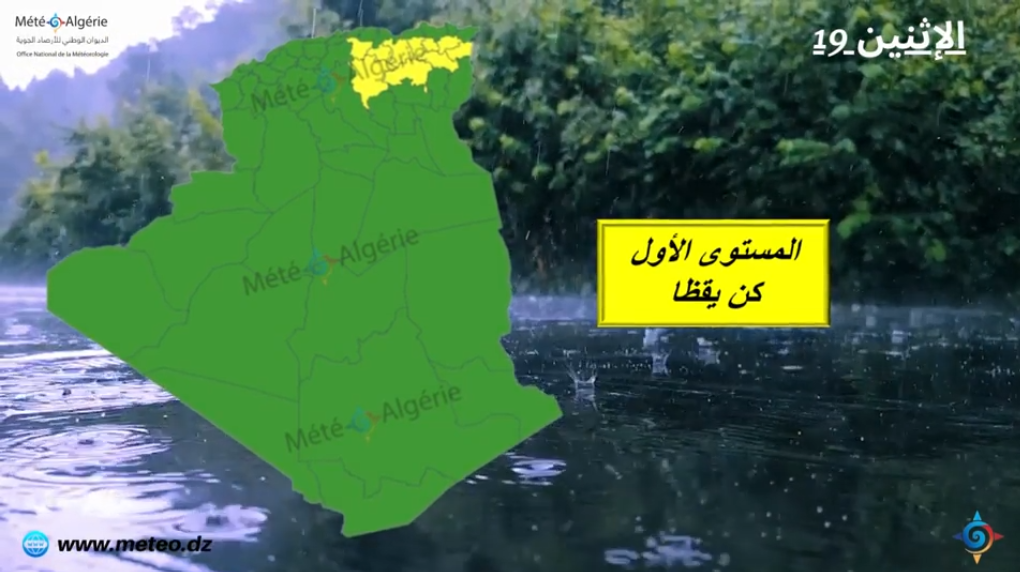تضع مصالح الديوان الوطني للأرصاد الجوية الجزائرية، تنبيه من المستوى الأول باللون الأصفر خاص بأمطار رعدية تميز الولايات الآتية: