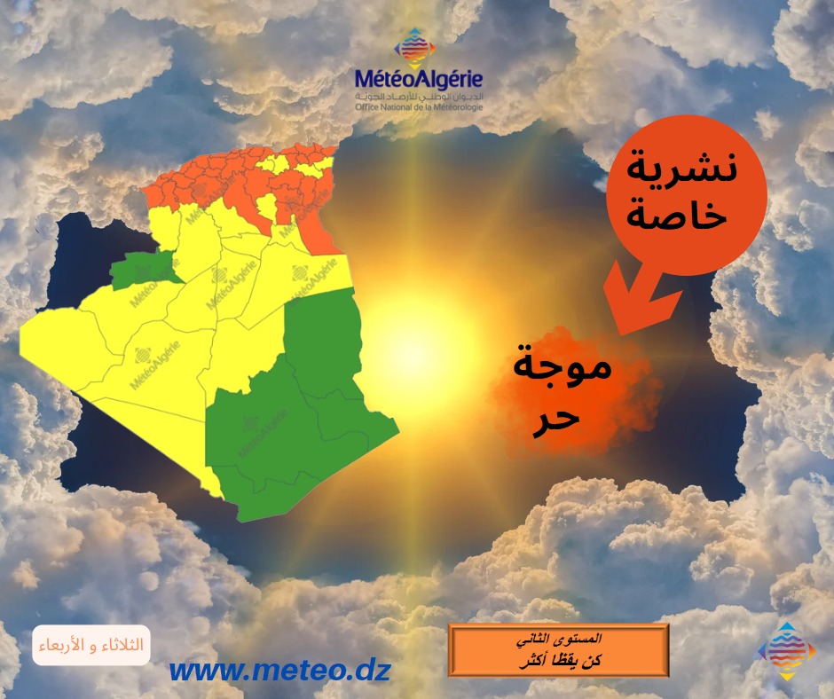 مصالح الديوان الوطني للأرصاد الجوية الجزائرية، تضع تنبيه من المستوى الثاني باللون البرتقالي، خاص باستمرار موجة الحر التي تجتاح جل ولايات الوطن، حيث أن درجات الحرارة القصوى تتراوح ما بين 44 إلى 46 درجة تحت الظل، في حين درجات الحرارة الدنيا تكون ما بين 28 إلى 34 درجة، صلاحية هذه النشرة طيلة يومي الثلاثاء والأربعاء.