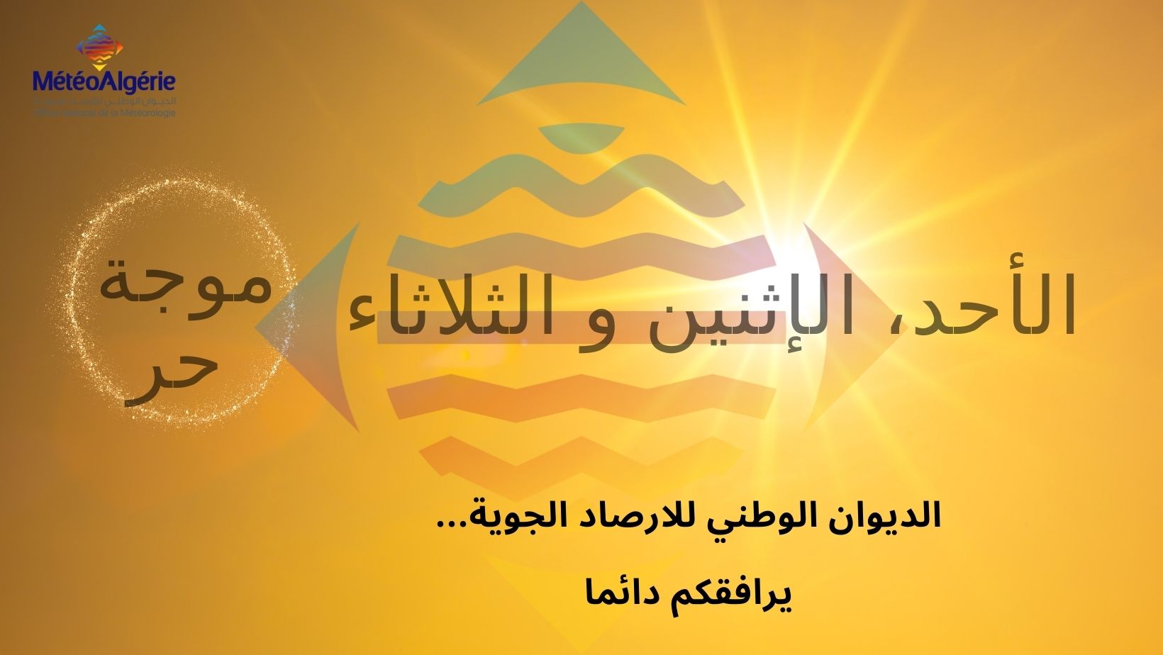 مصالح الديوان الوطني للأرصاد الجوية الجزائرية، تضع تنبيه من المستوى الثاني باللون البرتقالي، خاص باستمرار موجة الحر، صلاحية هذه النشرة طيلة أيام الأحد، الإثنين والثلاثاء. حيث أن: