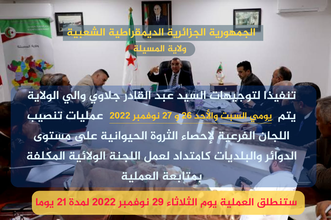 تم اليوم السبت 26 نوفمبر 2022 تنصيب لجنة فرعية لإحصاء الثروة الحيوانية في كل من دوائر وبلديات ولاية المسيلة