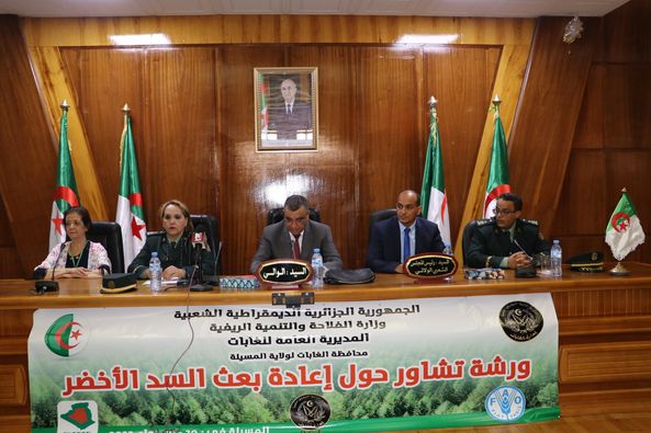 اشرف السيد عبد القادر جلاوي والي الولاية على افتتاح فعاليات الورشة التشاور المنظمة حول مشروع إعادة بعث السد الأخضر بالمسيلة، بحضور السيد رئيس المجلس الشعبي الولائي وكل من السادة: ممثلة وزارة الفلاحة والتنمية الريفية، المديرة المركزية لمكافحة التصحر والسد الأخضر بالمديرية العامة للغابات، السيدة ممثلة المنظمة العالمية للتغذية والزراعة، السيد ممثل المكتب الوطني للدراسات والتنمية الريفية بالبليدة، المحافظ الجهوي للسهوب، رؤساء لجان بالمجلس الشعبي الولائي، مدراء الهيئة التنفيذية، أسرة المجتمع المدني والاسرة والاعلامية.