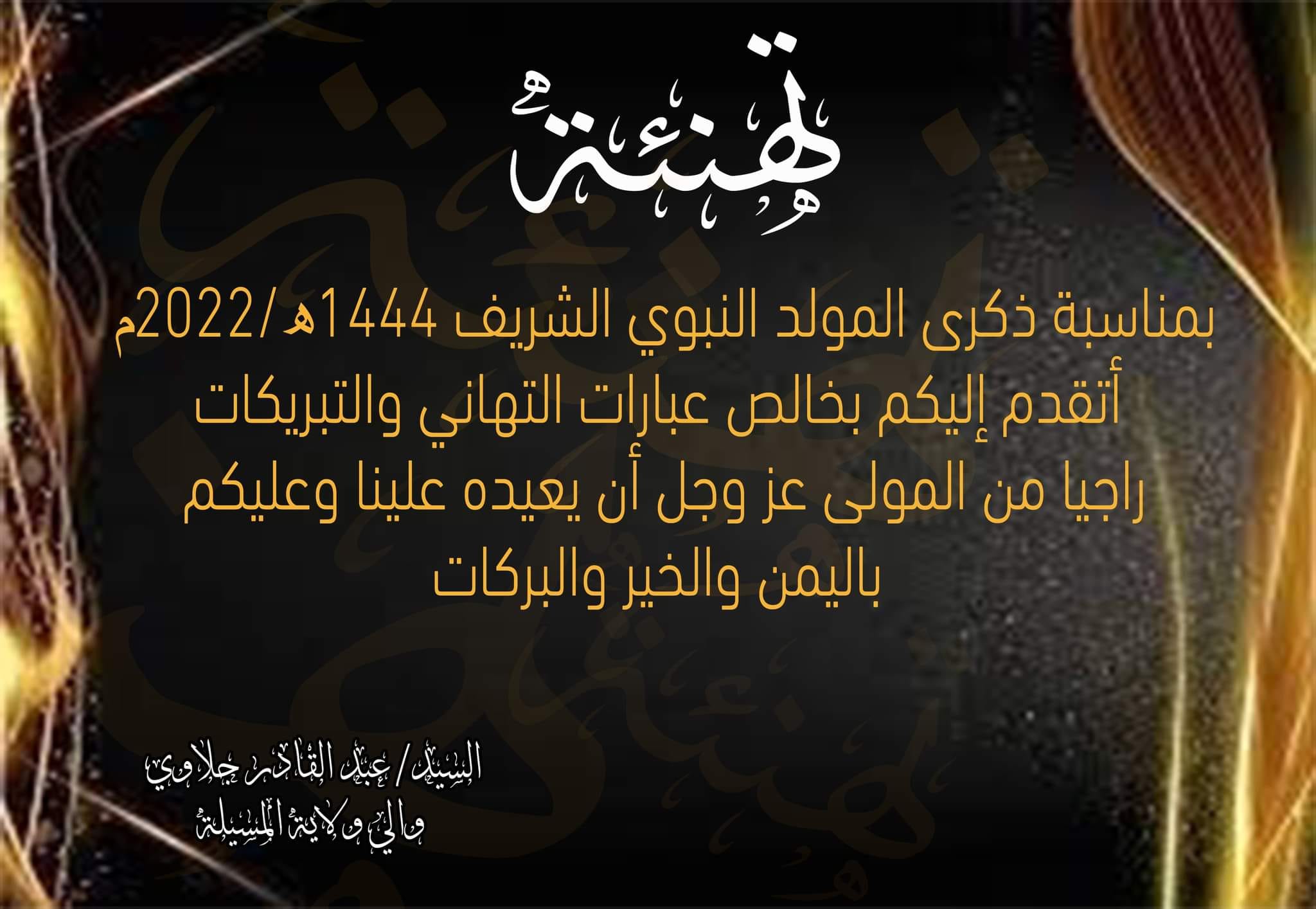 تهنئة السيد الوالي بمناسبة المولد النبوي الشريف7 أكتوبر، 20220 26 شاركها فيسبوك X مشاركة عبر البريد طباعة