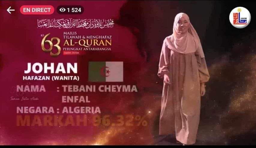 المسيلة/ بمناسبة فوز إبنة ولاية المسيلة الطالبة شيماء أنفال تباني وحصولها على المرتبة الأولى في مسابقة ماليزيا الدولية لحفظ القرآن الكريم وتلاوته.