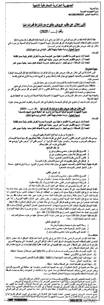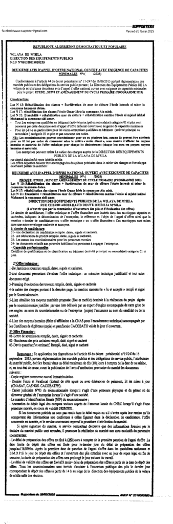 ثاني إعلان عن طلب عروض مفتوح دراسة متابعة وتهيئة للطور الابتدائي (برنامج 2023)/ مديرية التجهيزات العمومية لولاية المسيلة