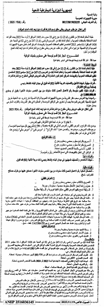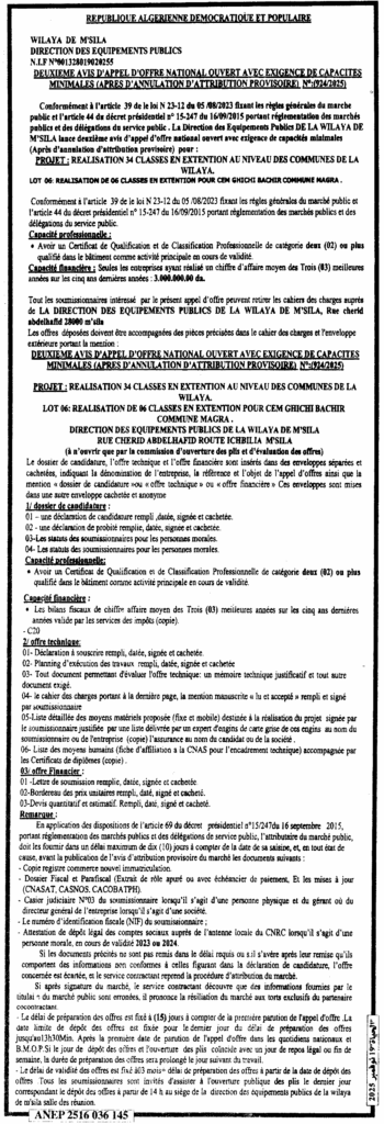 ثان إعلان عن طلب عروض وطني مفتوح 2025/924 مديرية التجهيزات العمومية لولاية المسيلة