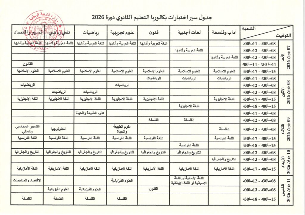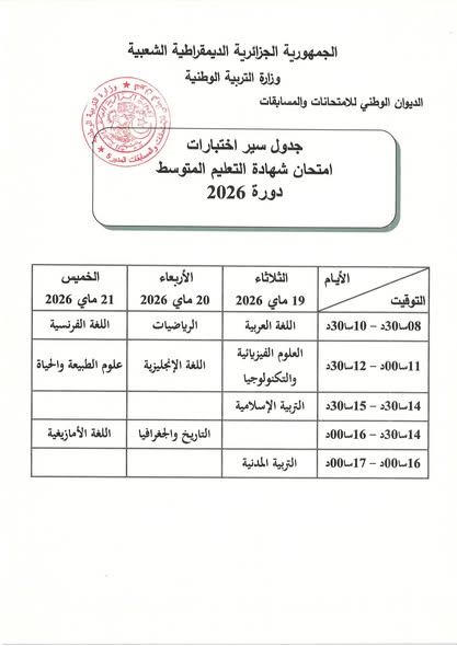جدولا سير امتحاني شهادتي التعليم المتوسط والبكالوريا دورة 2026
