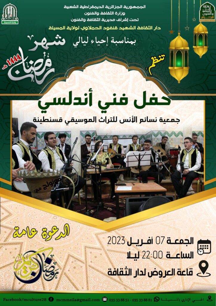 يوم الجمعة 07 أفريل 2023، حفل أندلسي لجمعية نسائم الأنس للتراث الموسيقي قسنطينةالدعوة عامة …… كونوا في الموعد6 أبريل، 20230 7 شاركها فيسبوك X مشاركة عبر البريد طباعة