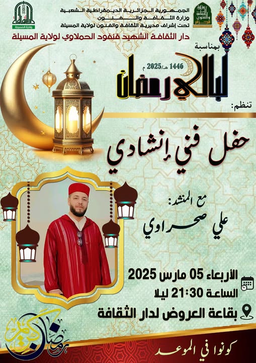 حفل إنشادي مع المنشد: علي صحراوي الأربعاء 05 مارس 2025 إبتداءً من الساعة التّاسعة والنصف (21:30 سا) بقاعة العروض لدار الثقافة.