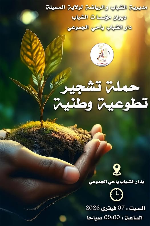 المسيلة/ في إطار برنامج الوزارة لترقية العمل التطوعي لدى الشباب وتعزيز الوعي البيئي، تنظم دار الشباب ياحي الجموعي حملة تشجير باشراف مديرية الشباب والرياضة، ديوان مؤسسات الشباب، وبمشاركة إطارات المؤسسة والمنخرطين والجمعيات الشريكة، وبالتعاون مع الكشافة الإسلامية الجزائرية.