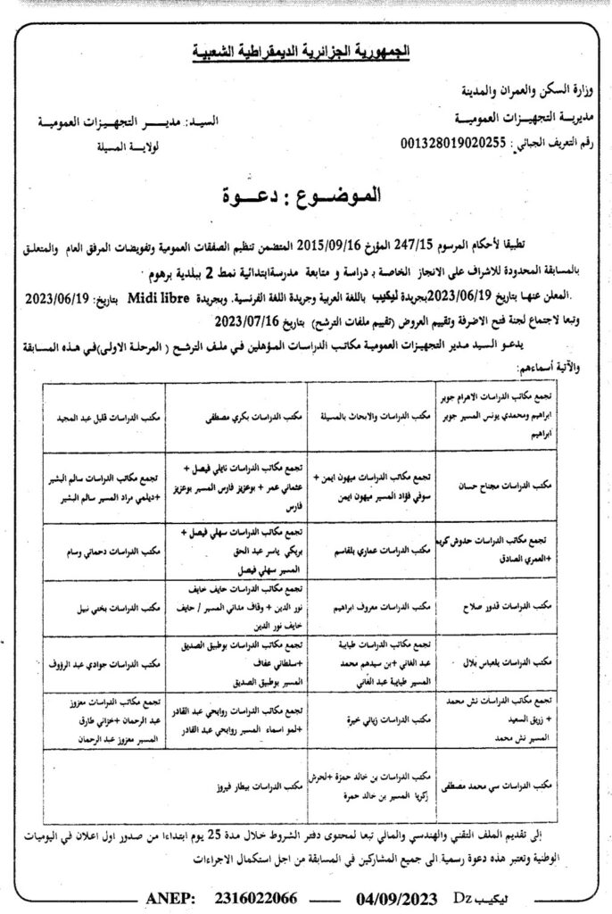 دعــوة/ مديرية التجهيزات العمومية لولاية المسيلة