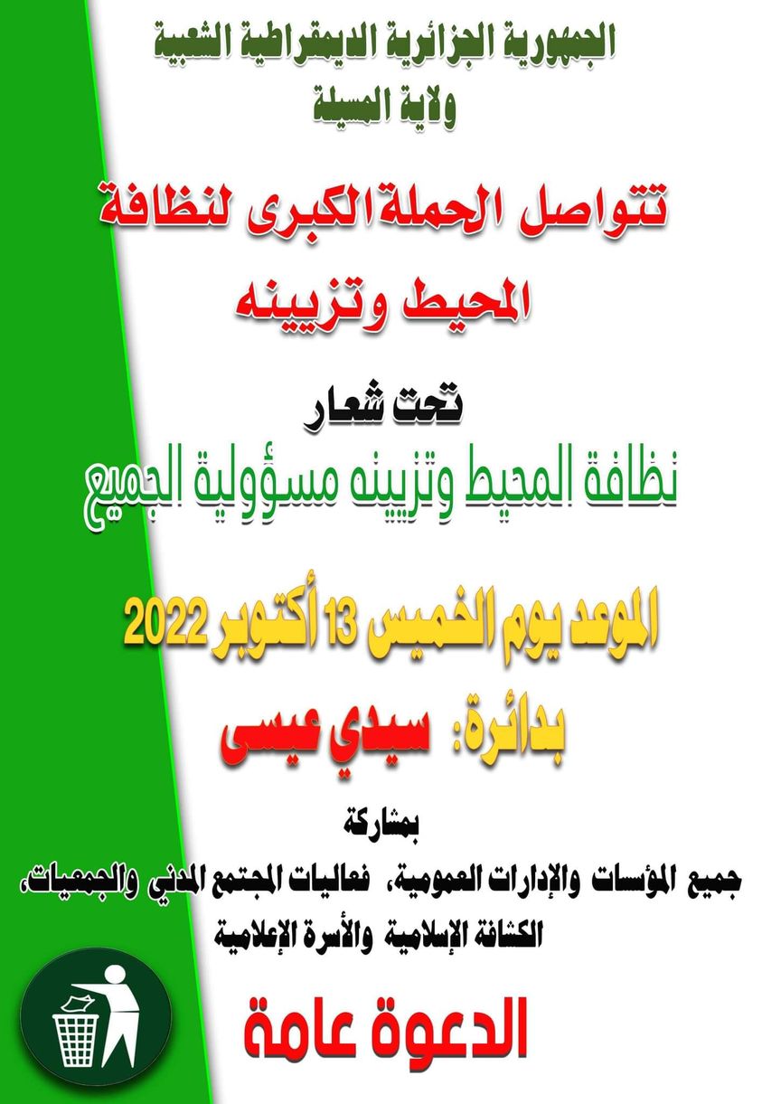 الدعوة عامة .. المحطة هذه المرة بدائرة سيدي عيسى، الموعد يوم الخميس 13 أكتوبر 2022 مواصلة للحملة الكبرى لتنظيف المحيط وتزيينه لتمس جميع بلديات الولاية.
