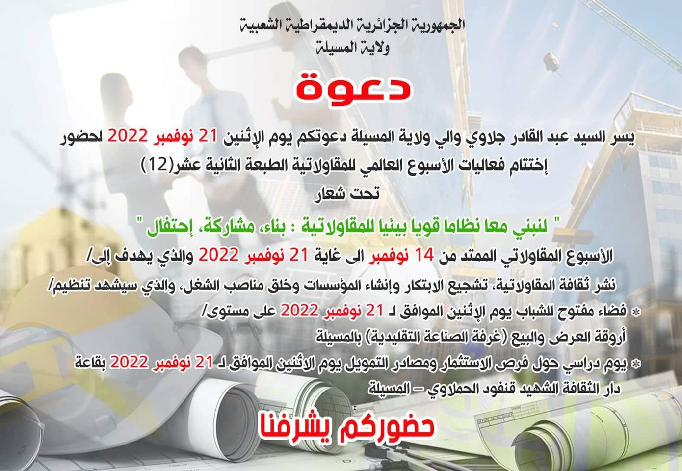 المسيلة/ الموعد غدا الاثنين 21 نوفمبر 2022، سيشرف السيد عبد القادر جلاوي والي الولاية على إختتام فعاليات الاسبوع العالمي للمقاولاتية المنظم بولاية المسيلة.