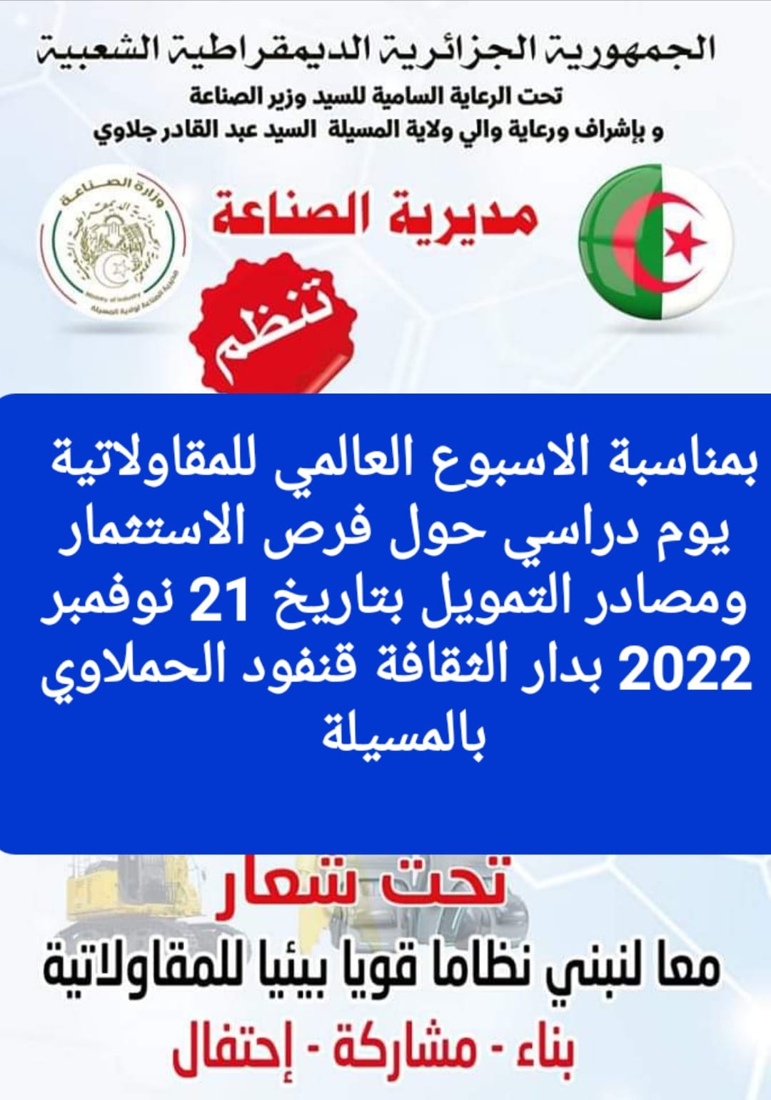ينظم بتاريخ 21 نوفمبر 2022 يوم دراسي حول فرص الإستثمار بالولاية ومصادر التمويل بدار الثقافة قنفود الحملاوي بالمسيلة