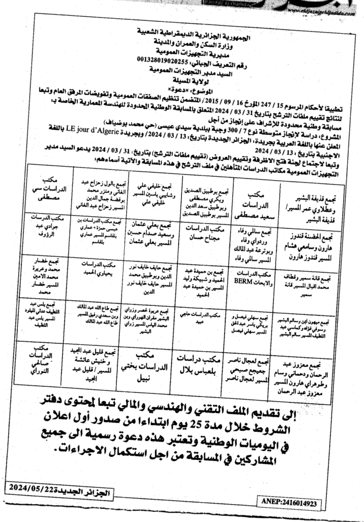 دعوة للاشراف على دراسة لانجاز متوسطة نوع300/7 وجبة ببلدية سيدي عيسى (حي محمد بوضياف)/ مديرية التجهيزات العمومية لولاية المسيلة