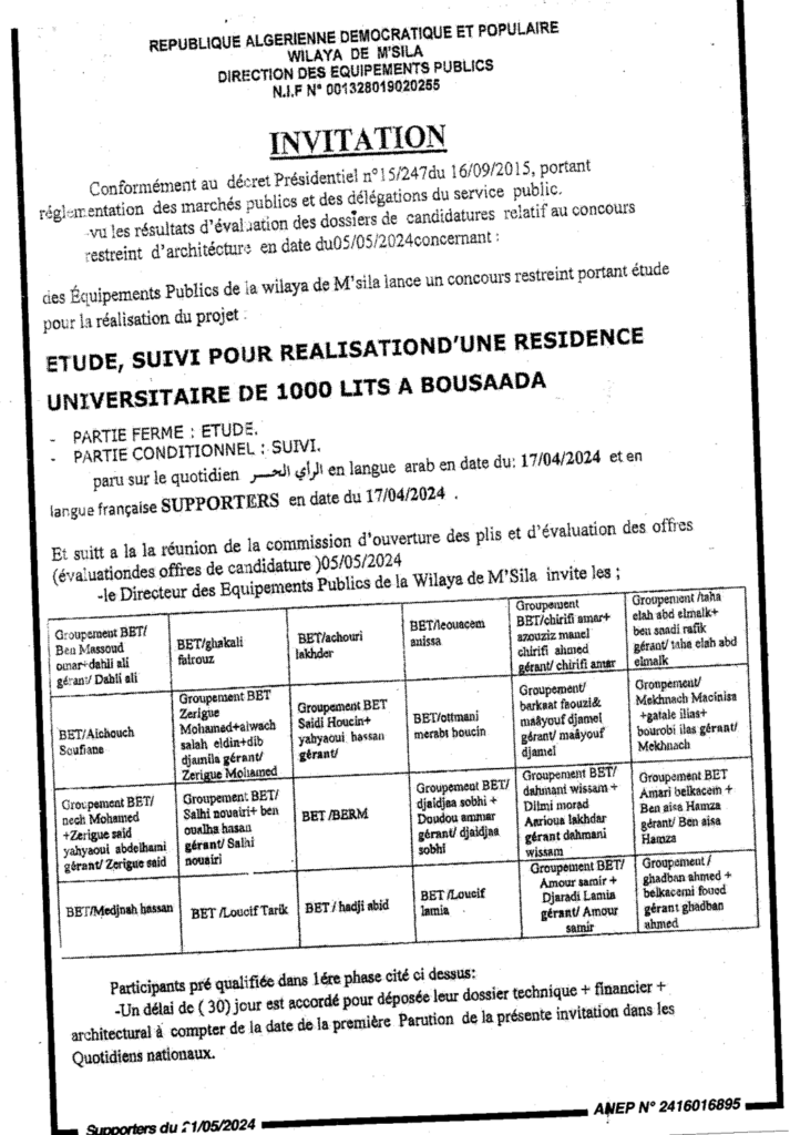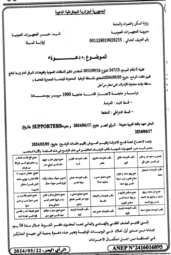 دعوة للاشراف على دراسة ومتابعة لانجاز إقامة جامعية 1000 سرير بوسعادة/ مديرية التجهيزات العمومية لولاية المسيلة
