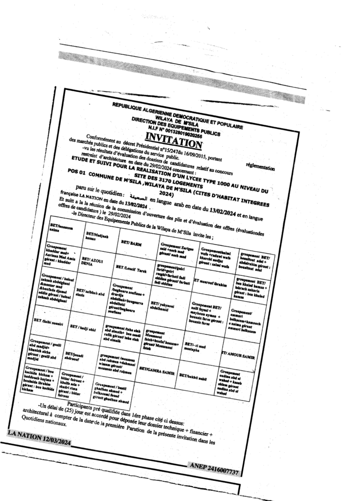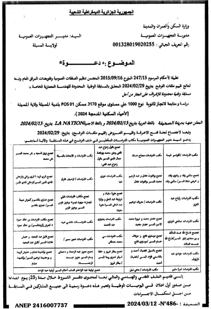 دعوة للمسابقة الوطنية المحدودة للهندسة المعمارية لأجل دراسة ومتابعة لانجاز ثانوية نوع 1000 على مستوى موقع 3170 مسكن 01 POS بلدية المسيلة/ مديرية التجهيزات العمومية لولاية المسيلة