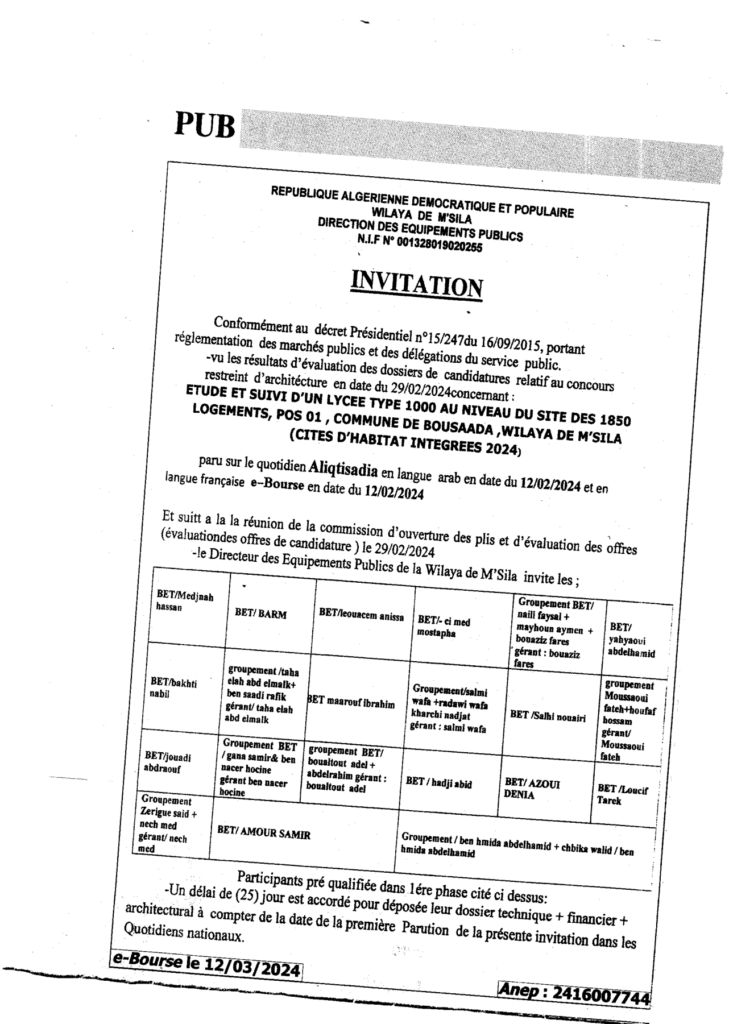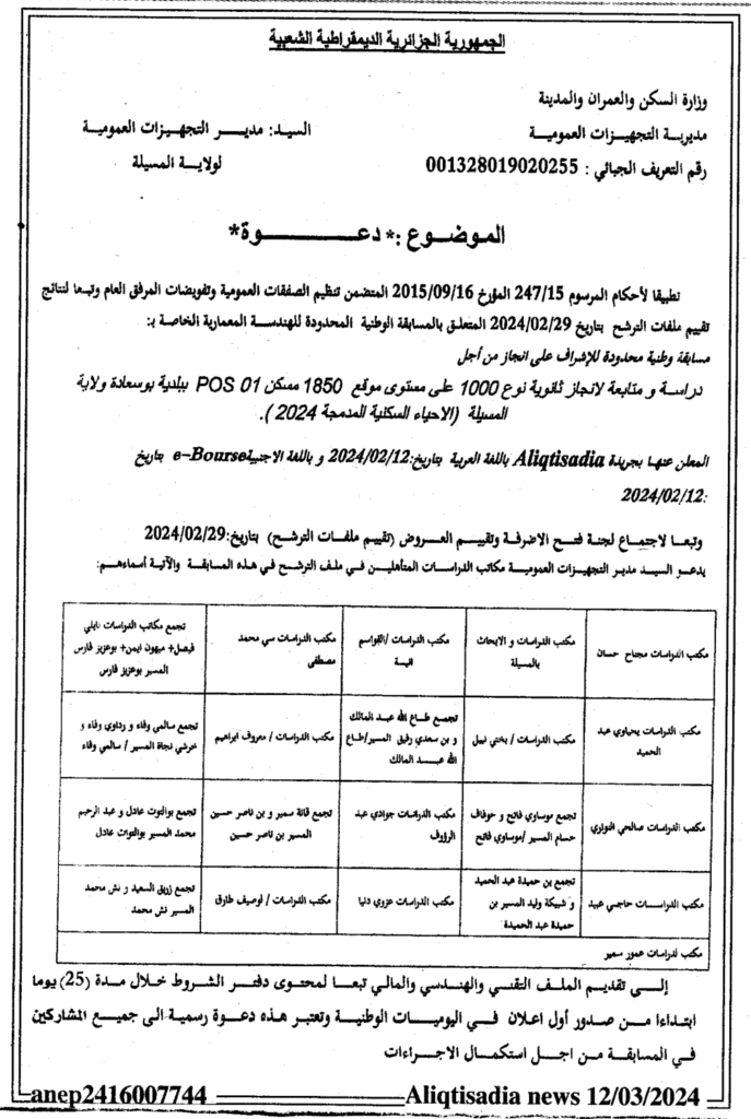 دعوة للمسابقة الوطنية المحدودة للهندسة المعمارية لأجل دراسة ومتابعة لانجاز ثانوية نوع 1000 على مستوى موقع 1850 مسكن 01 POS بلدية بوسعادة/ مديرية التجهيزات العمومية لولاية المسيلة