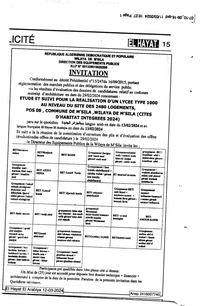 دعوة للمسابقة الوطنية المحدودة للهندسة المعمارية لأجل دراسة ومتابعة لانجاز ثانوية نوع 1000 على مستوى موقع 2480 مسكن 08 POS بلدية المسيلة/ مديرية التجهيزات العمومية لولاية المسيلة