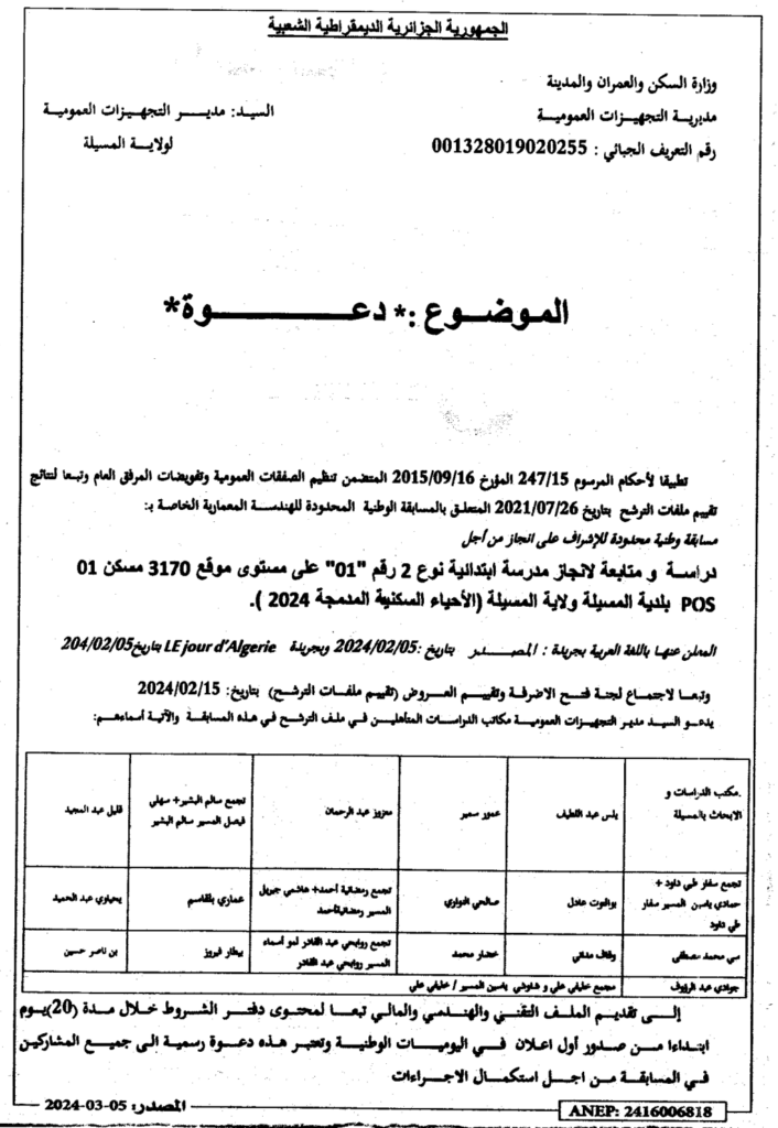 دعوة لمسابقة الوطنية محدودة للهندسة المعمارية للاشراف على دراسة ومتابعة لانجاز مدرسة ابتدائية نوع 2 على مستوى موقع 3170 مسكن 01 POS بلدية المسيلة/ مديرية التجهيزات العمومية لولاية المسيلة