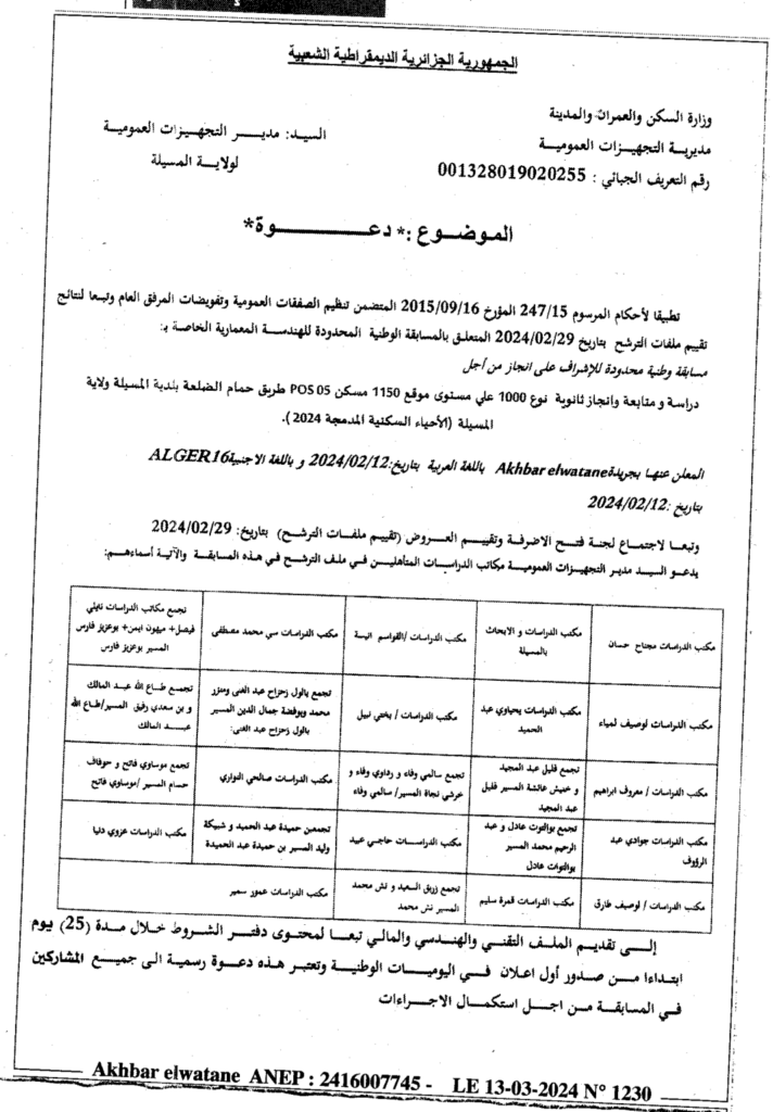 دعوة لمسابقة الوطنية محدودة للهندسة المعمارية للاشراف على دراسة ومتابعة وإنجاز ثانوية نوع 1000 على مستوى موقع 1150 مسكن 05 POS طريق حمام الضلعة بلدية المسيلة/ مديرية التجهيزات العمومية لولاية المسيلة