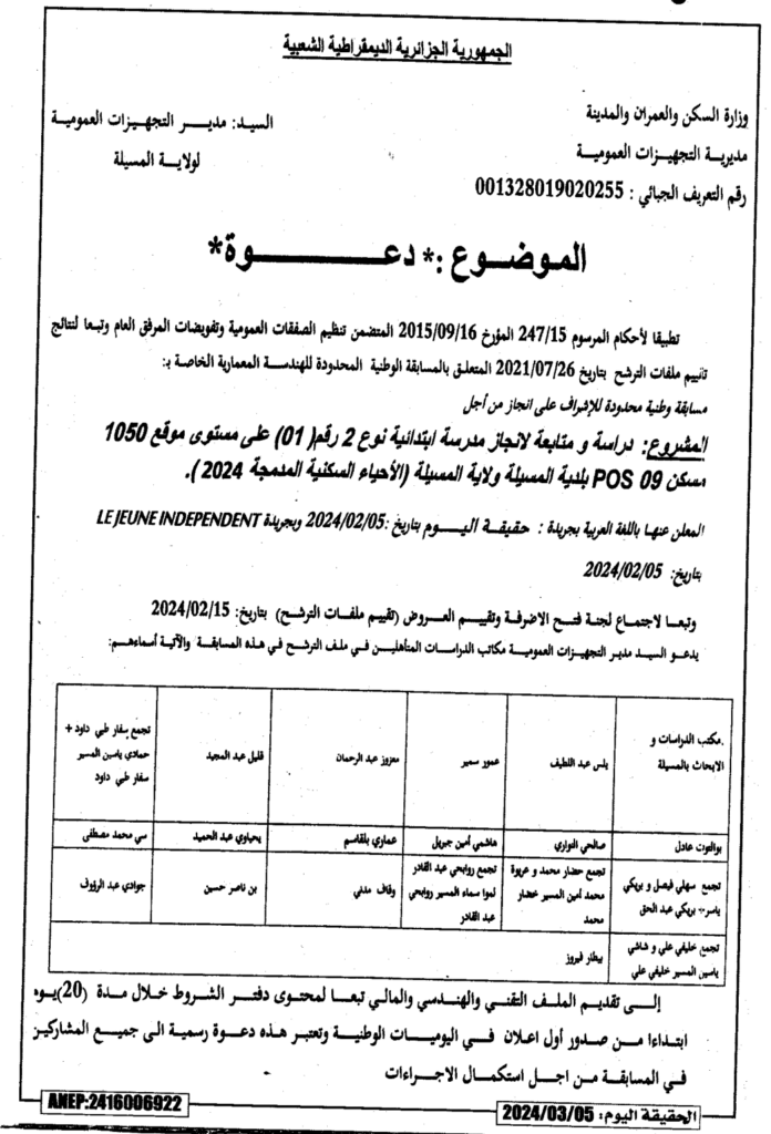 دعوة لمسابقة الوطنية محدودة للهندسة المعمارية للاشراف على دراسة ومتابعة لانجاز مدرسة ابتدائية نوع 2 على مستوى موقع 1050 مسكن 09 POS بلدية المسيلة/ مديرية التجهيزات العمومية لولاية المسيلة
