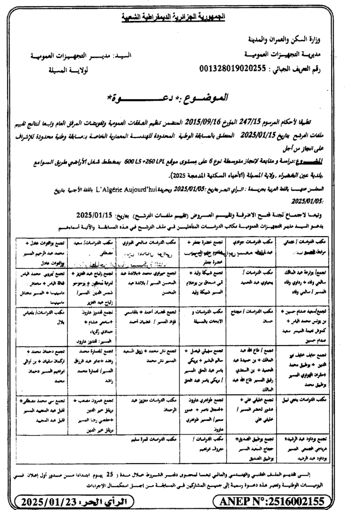 دعوة متعلقة بالمسابقة الوطنية المحدودة للهندسة المعمارية من أجل دراسة ومتابعة لانجاز متوسطة نوع 6 على مستوى موقع 260 LPL + 600 LS بمخطط شغل الأراضي طريق السوامع/ مديرية التجهيزات العمومية لولاية المسيلة