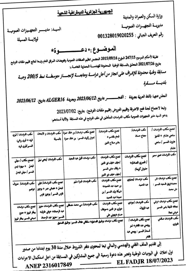 دعوة متعلقة بمسابقة المحدودة للهندسة المعمارية الخاصة بـ : دراسة ومتابعة لانجاز متوسطة نمط 200/5 وجبة بلدية مقرة18 يوليو، 20230 1 شاركها فيسبوك X مشاركة عبر البريد طباعة