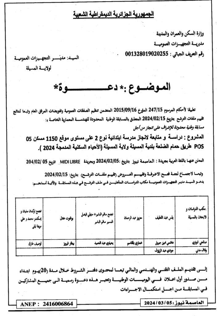 دعوة لمسابقة الوطنية محدودة للهندسة المعمارية للاشراف على دراسة ومتابعة لانجاز مدرسة ابتدائية نوع 2 على مستوى موقع 1150 مسكن 05 POS طريق حمام الضلعة بلدية المسيلة/ مديرية التجهيزات العمومية لولاية المسيلة
