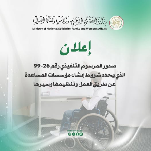 بموجب أحكام المادة 31 من القانون رقم 25-01 المؤرخ في 21 شعبان عام 1446 الموافق 20 فبراير سنة 2025 والمتعلق بحماية الأشخاص ذوي الاحتياجات الخاصة وترقيتهم، صدر المرسوم التنفيذي رقم26-99 مؤرخ في 12 شعبان عام 1447 الموافق 31 جانفي 2026، يحدد شروط إنشاء مؤسسات المساعدة عن طريق العمل وتنظيمها وسيرها، والذي يهدف إلى ترقية العمل المحمي للأشخاص ذوي الاحتياجات الخاصة الذين لديهم قدرات محدودة لا تسمح لهم بممارسة نشاط مهني في وسط العمل العادي، وذلك عبر مؤسسات المساعدة عن طريق العمل من أجل تشجيع ادماجهم واندماجهم الاجتماعي.