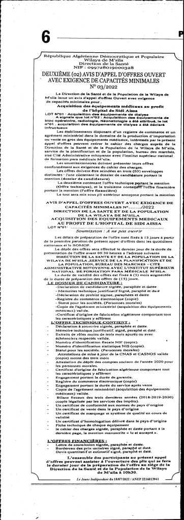 إعلان ثاني عن طلب العروض: اقتناء تجهيزات طبية لفائدة مستشفى سيدي عيسى مديرية الصحة والسكان
