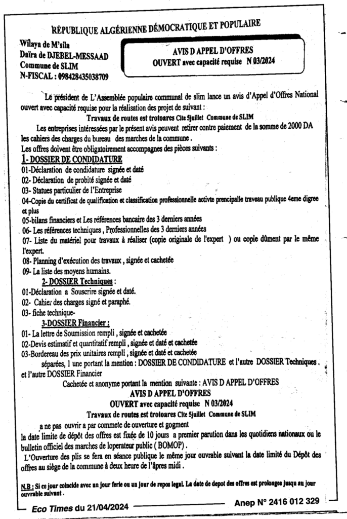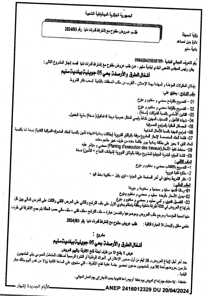طلب عروض مفتوج 2024/03 بلدية سليم