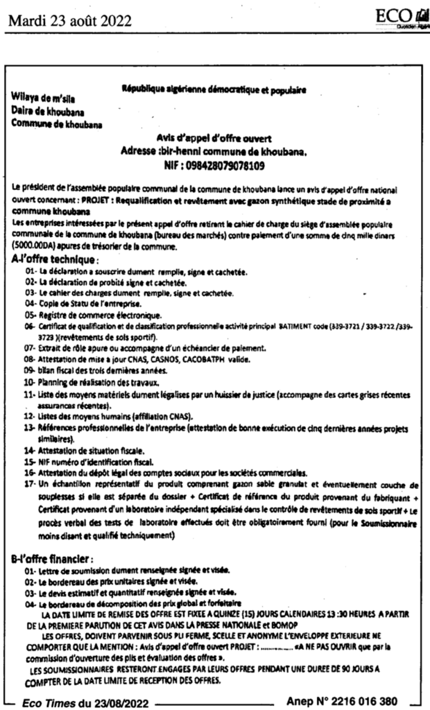 طلب عروض وطني مفتوح مع اشتراط قدرات دنيا للمشروع: إعادة التأهيل والتسطيح بعشب صناعي قريب من الملعب في بلدية الخُبانة23 أغسطس، 20220 10 شاركها فيسبوك X مشاركة عبر البريد طباعة