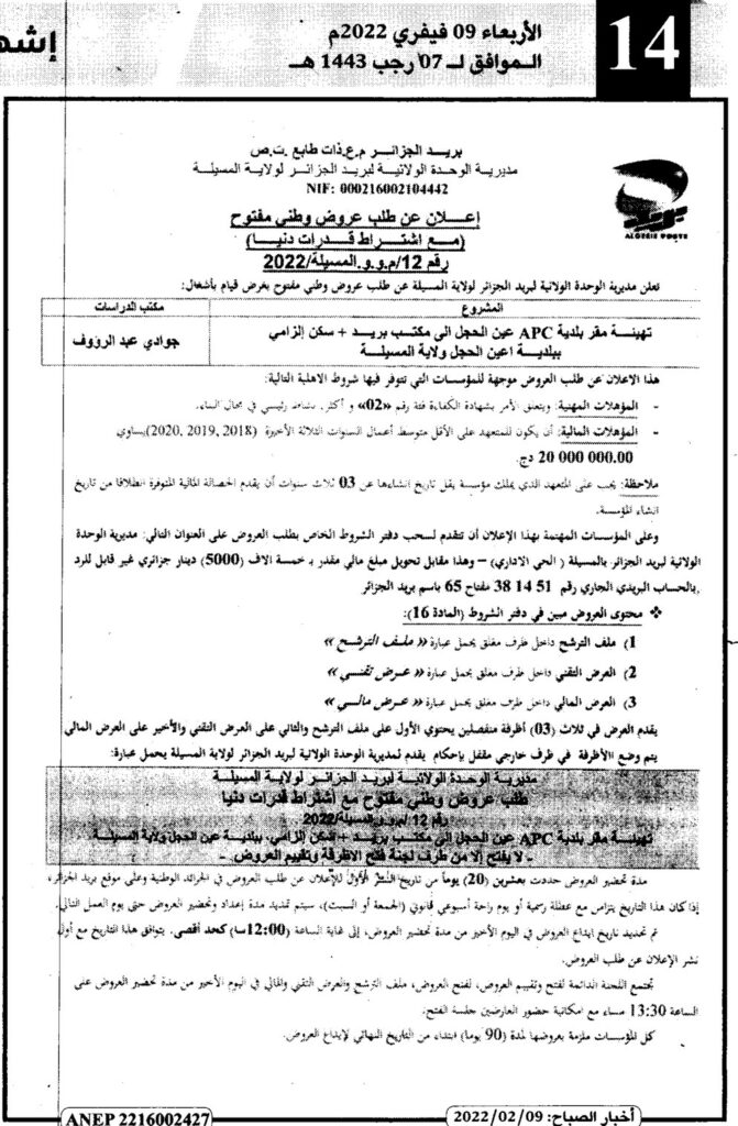 طلب عروض وطني مفتوح بغرض القيام بأشغال: تهيئة مقر البلدية APC عين الحجل إلى مكتب بريد + سكن إلزامي ببلدية عين الحجل10 فبراير، 2022 884 شاركها فيسبوك X مشاركة عبر البريد طباعة
