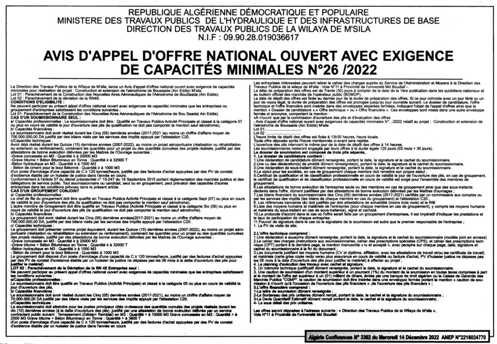 طلب عروض وطني مفتوح 2022/26/ مديرية الأشغال العمومية لولاية المسيلة