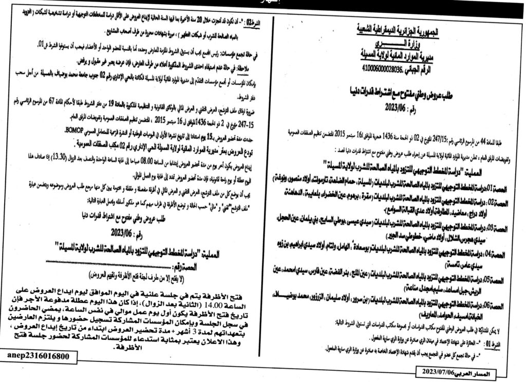 طلب عروض وطني مفتوح 2023/06 مديرية الموارد المائية لولاية المسيلة