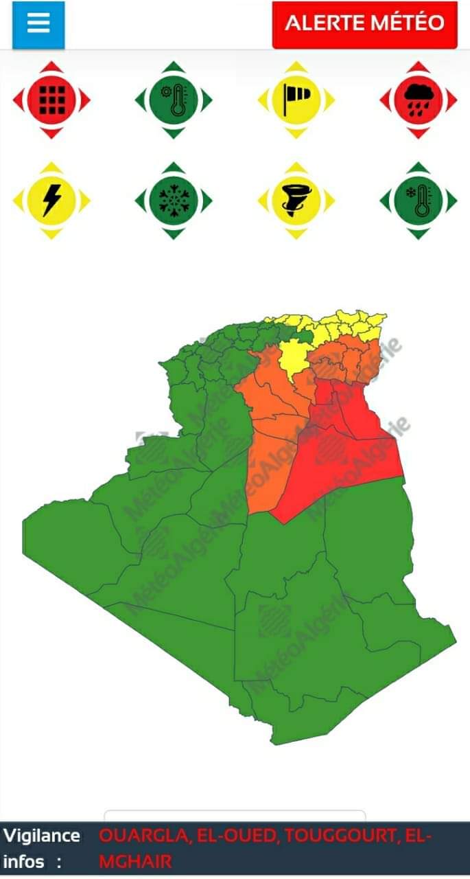 صلاحية النشرية من مساء اليوم الجمعة 12 أفريل 2024 على الساعة 18:00 إلى غاية مساء يوم السبت 13 أفريل 2024 على الساعة 18:00 مساءا، نحذر من إحتمالية تشكل سيول وجريان للأودية عبر إقليم الولاية، وعليه ننبه كافة مواطني الولاية مع ضرورة أخذ الحيطة والحذر.