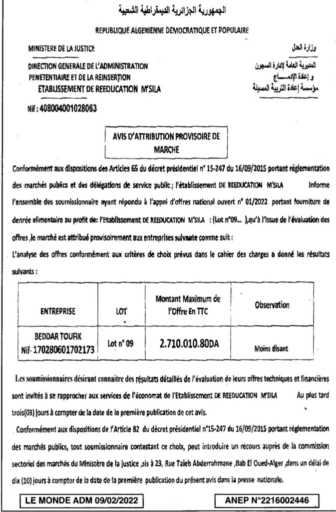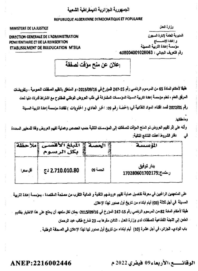 طلب العروض الوطني المفتوح مع اشتراط قدرات دنيا تحت رقم 2022/01 قصد اقتناء المواد الغذائية لفائدة مؤسسة إعادة التربية المسيلة9 فبراير، 20220 37 شاركها فيسبوك X مشاركة عبر البريد طباعة