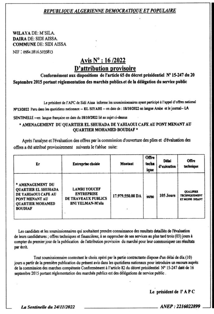 علان عن المنح المؤقت 2022/16 بلدية سيدي عيسى