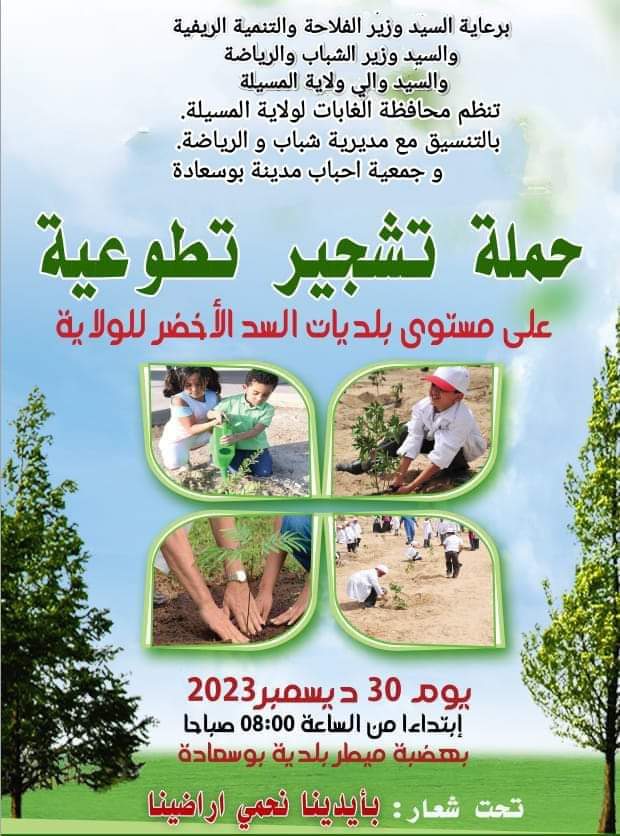 المسيلة/ تحت رعاية السيد وزير الفلاحة والتنمية الريفية والسيد وزير الشباب والرياضة والسيد والي ولاية المسيلة تتشرف محافظة الغابات بالتنسيق مع مديرية الشباب والرياضة وجمعية أحباب مدينة بوسعادة بدعوتكم للمشاركة في عملية غرس تطوعية لـغرس أشجار غابية على مستوى محمية هضبة ميطر ببلدية بوسعادة غدا السبت 30 ديسمبر 2023 ابتداءا من ساعة ثامنة صباحا.