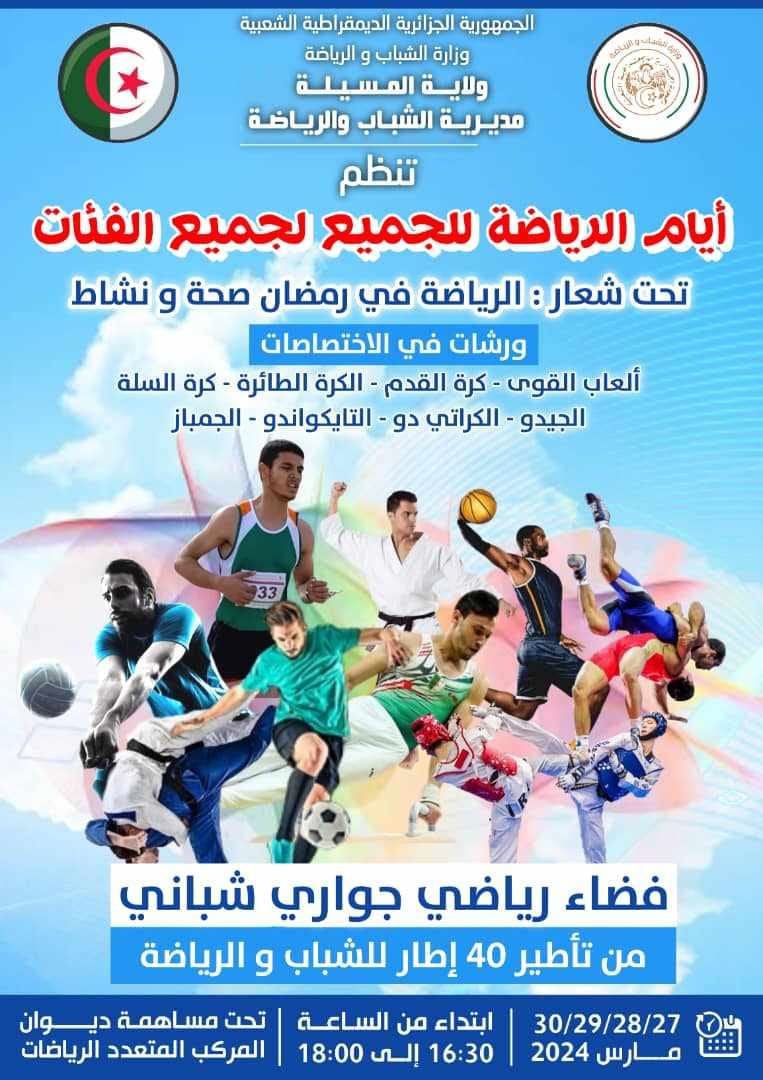 المسيلة/ سوف تكون هناك قافلة ترفيهية وتنشيطية لفائدة الأطفال بمناسبة العطلة الربيعية، حيث سيتم تقديم عروض بهلوانية والعاب ترفيهية(ألعاب الطوبوقو والترومبولين) من تنشيط رابطة أنشطة الهواء الطلق والترفيه وتبادل الشباب بالمسيلة.