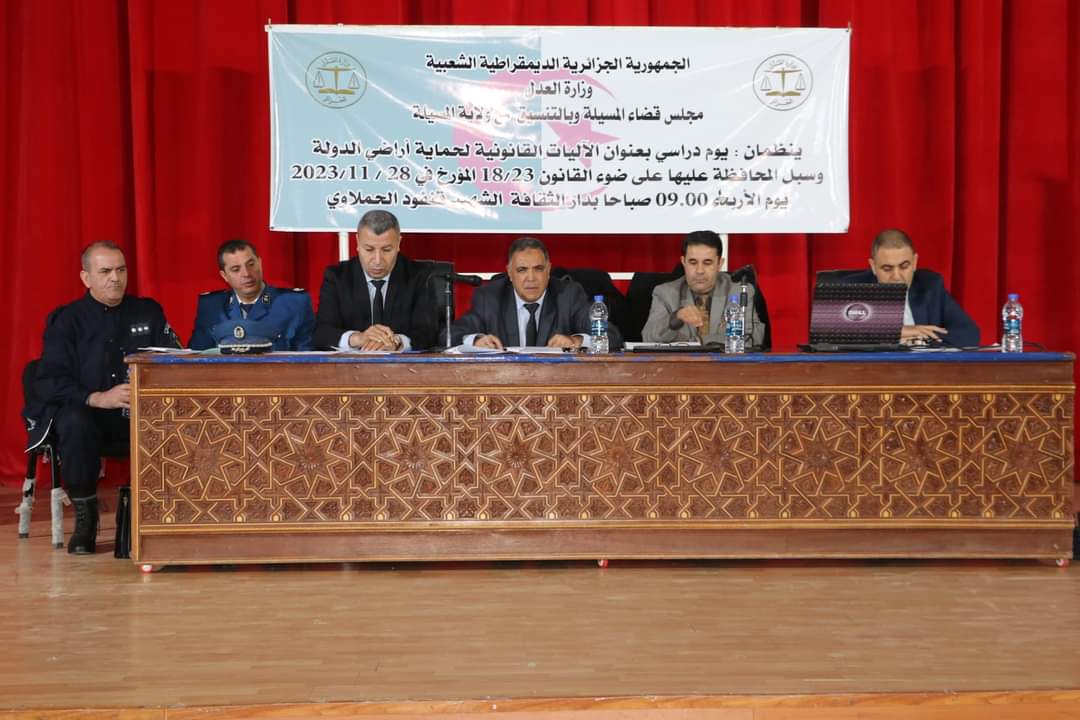 المسيلة/ شارك اليوم الأربعاء 21 فيفري 2024، السيد نجم الدين طيار والي الولاية، فعاليات أشغال اليوم الدراسي حول موضوع “الآليات القانونية لحماية أراضي الدولة وسبل المحافظة عليها” على ضوء القانون 23/18 المؤرخ في 28/11/2023، من تنظيم مجلس قضاء المسيلة بالتنسيق مع مصالح الولاية، بقاعة المحاضرات الشهيد قنفود الحملاوي بالمسيلة، بحضور كل من السادة : رئيس المجلس الشعبي الولائي، الوالي المنتدب لبوسعادة، رئيس مجلس قضاء المسيلة، النائب العام لدى مجلس قضاء المسيلة، أعضاء اللجنة الولائية للأمن، المندوب المحلي لوسيط الجمهورية، السادة مدراء التنظيم والشؤون العامة، مدير الإدارة المحلية، مدير الجامعة، مدير الحماية المدنية، السيدات والسادة أسرة قطاع العدالة، السيدة والسادة رؤسـاء الـدوائر، السيدة والسادة مدراء أملاك الدولة: الحفظ العقاري ومسح الأراضي, التعمير والهندسة المعمارية، السيدات والسادة مدراء الهيئة التنفيذية، السادة رؤساء المجالس الشعبية البلدية، السيدات والسادة المحافظون العقاريون، مفتشو أملاك الدولة، مفتشو التعمير والبناء، أعضاء الأسرة الإعلامية.