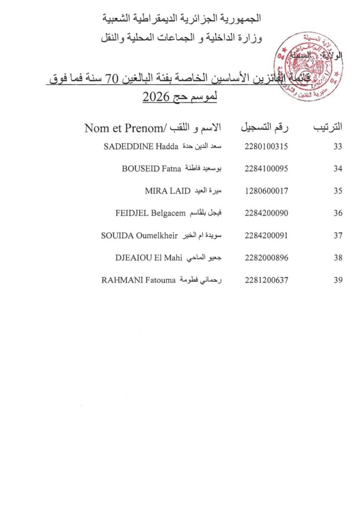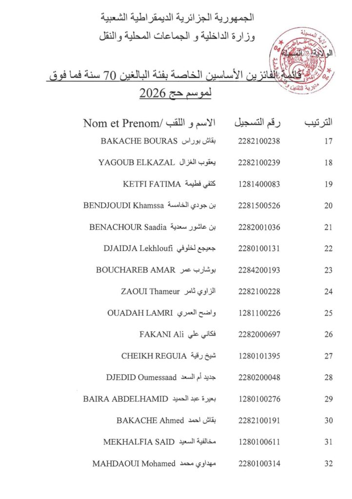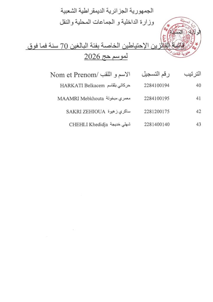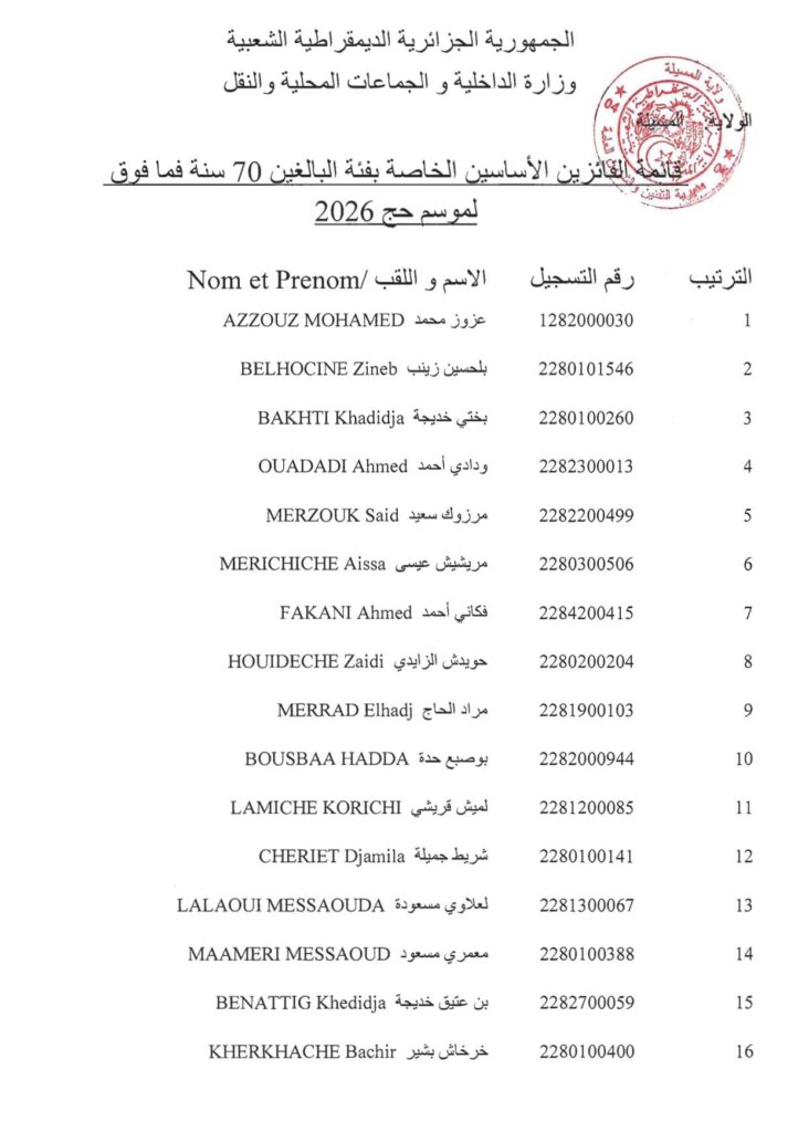 قائمة الفائزين الأساسين الخاصة بفئة البالغين 70 سنة فما فوق لموسم الحج 2026منذ يوم واحد0 5 شاركها فيسبوك X مشاركة عبر البريد طباعة