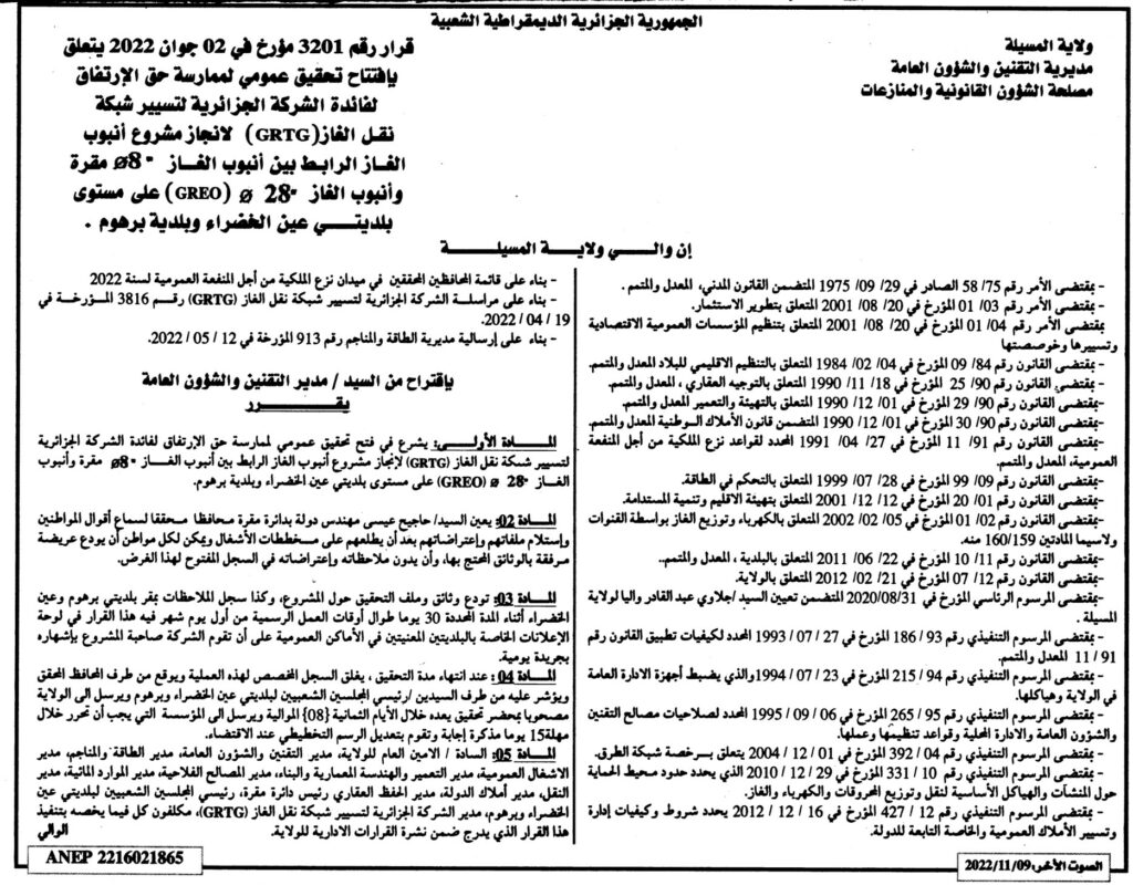 قرار رقم 3201 مؤرخ في 02 جوان 2022 يتعلق بإفتتاح تحقيق عمومي لممارسة حق الإرتفاق لفائدة الشركة الجزائرية لتسيير شبكة نقل الغاز (GRTG) لإنجاز مشروع أنبوب الغاز الرابط بين أنبوب الغاز 8 مقرة وأنبوب الغاز 28 (GREO) على مستوى بلديتي عين الخضراء وبلدية برهوم
