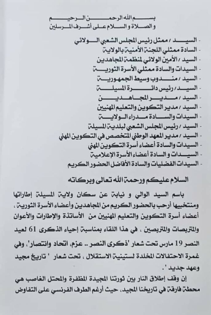 كلمة السيد والي ولاية المسيلة خلال افتتاح أسبوع الذاكرة الوطنية على مستوى مركز التكوين المهنى والتمهين مسيلة 2.16 مارس، 20230 9 شاركها فيسبوك X مشاركة عبر البريد طباعة