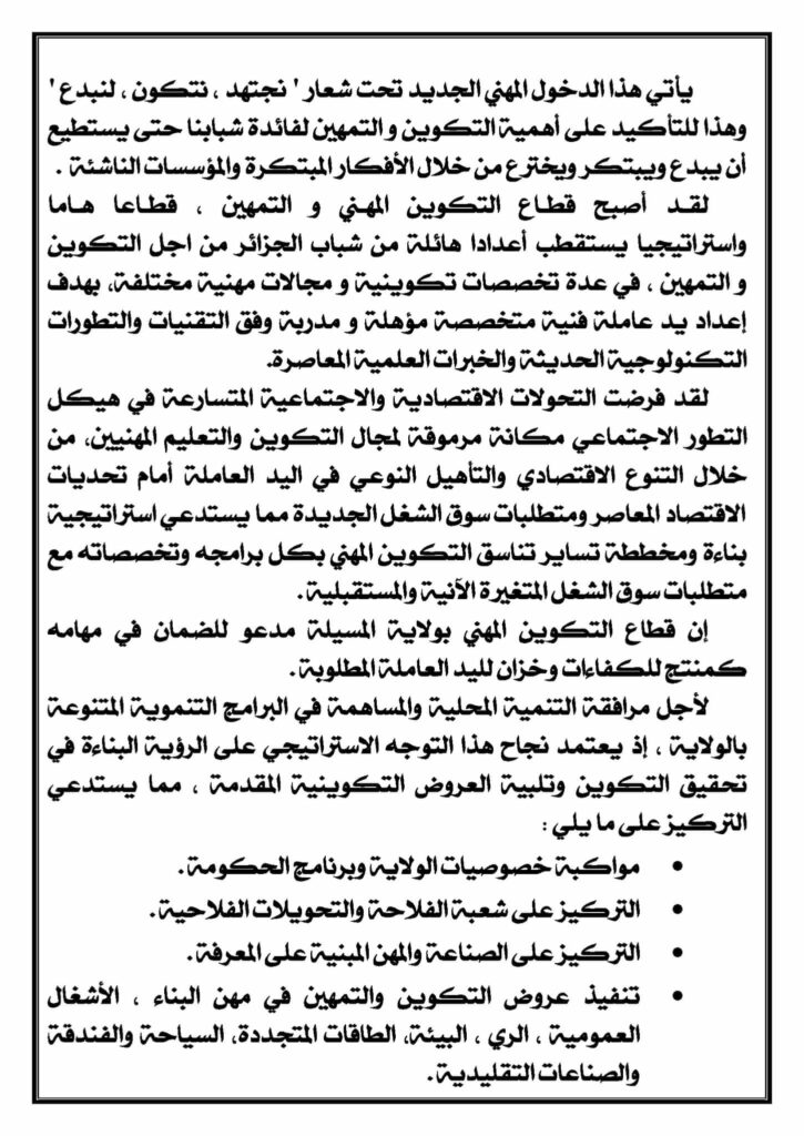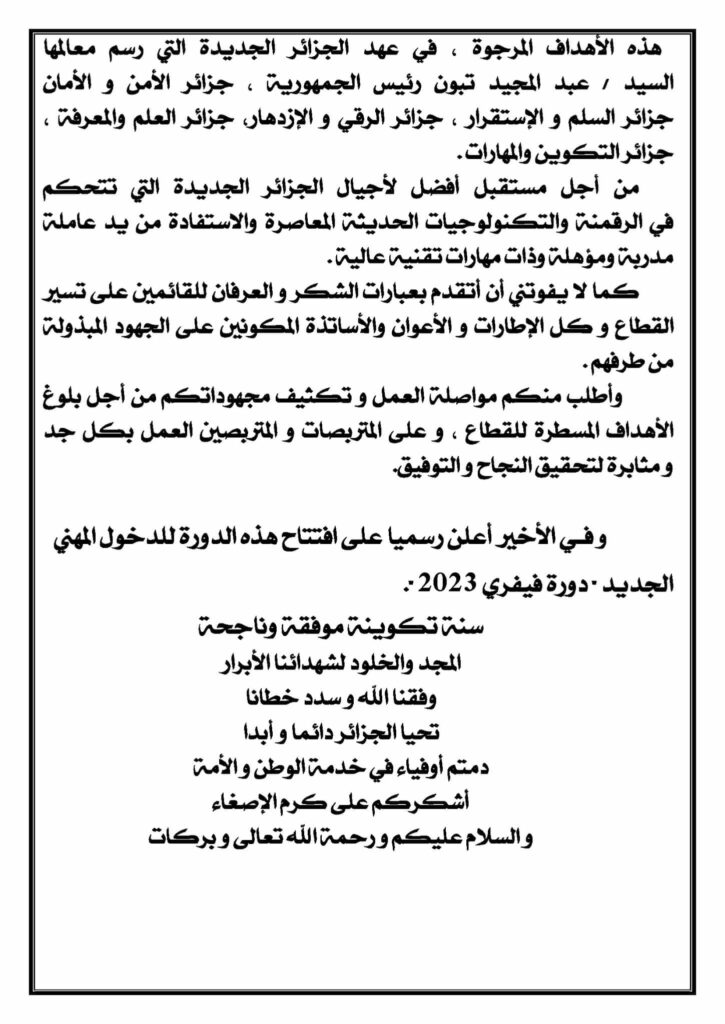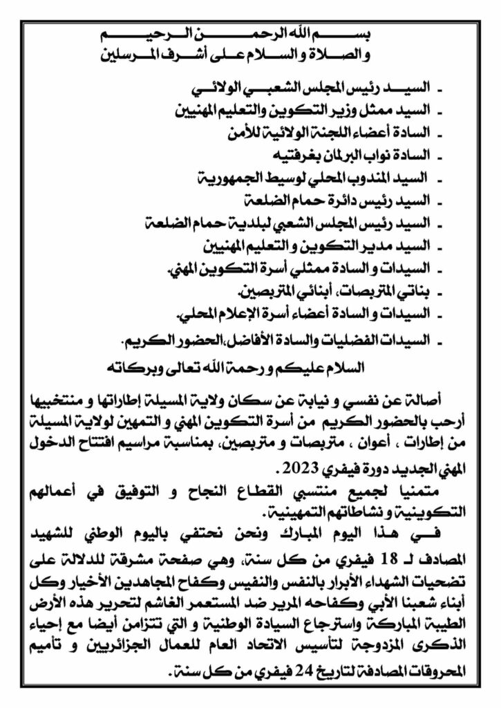 كلمة السيد عبدالقادر جلاوي والي الولاية بمناسبة افتتاح دورة الدخول المهني الجديد، دورة فيفري 2023 ببلدية حمام الضلعة.26 فبراير، 20230 39 شاركها فيسبوك X مشاركة عبر البريد طباعة